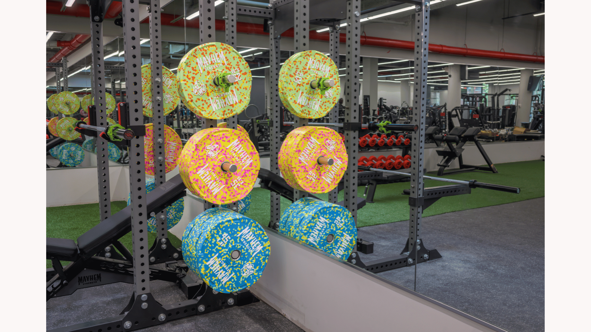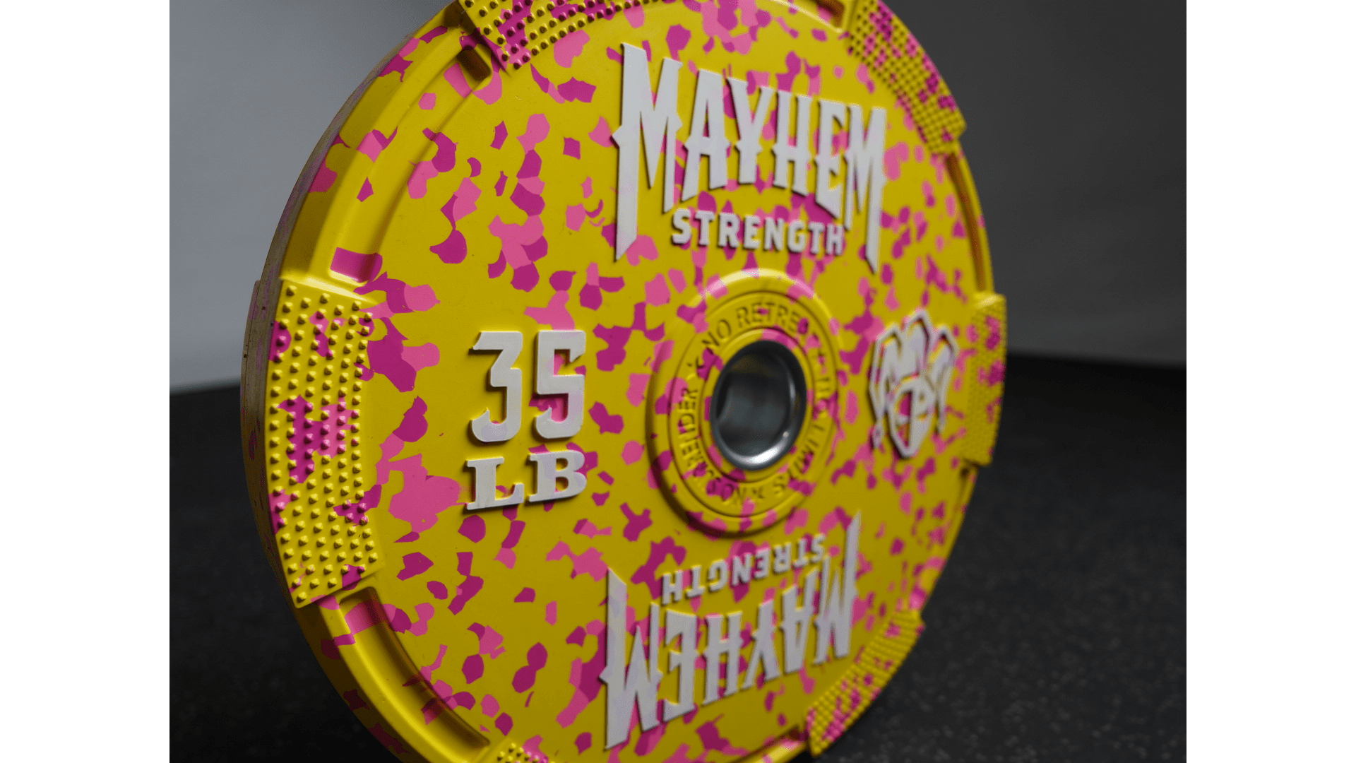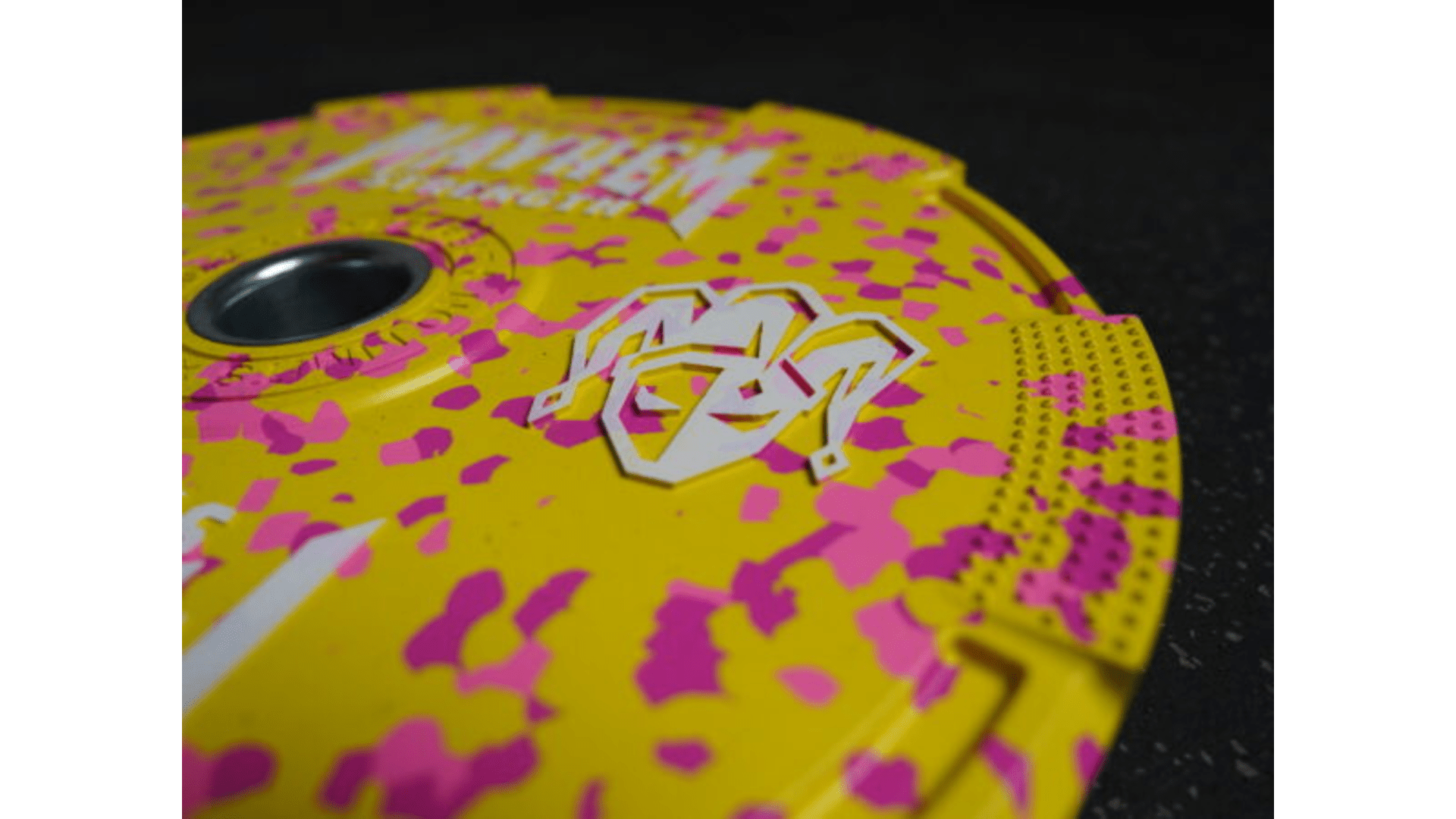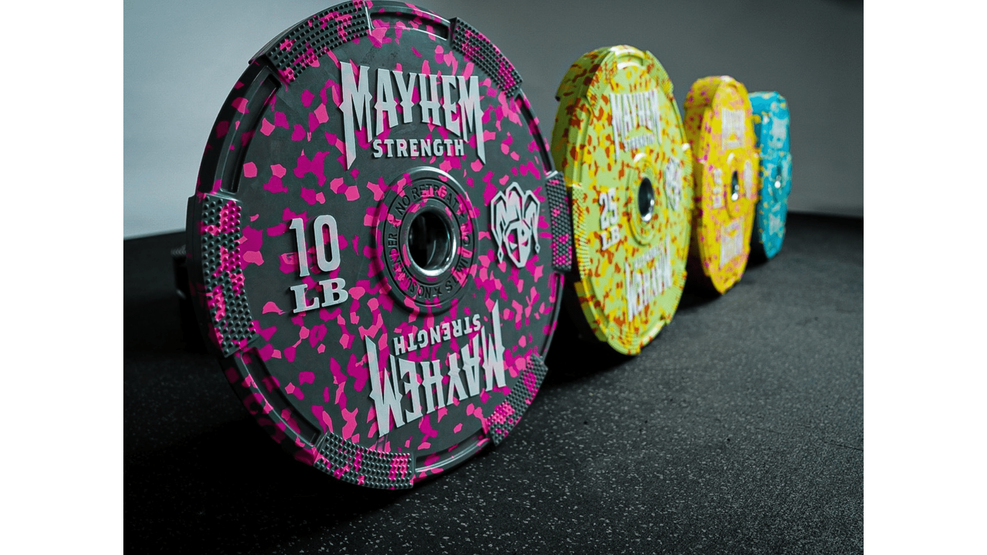 The Mayhem Strength Neon Fleck Bumper Plates are designed to absorb the impact of dropped weights, reducing noise and protecting your gym floor from damage.